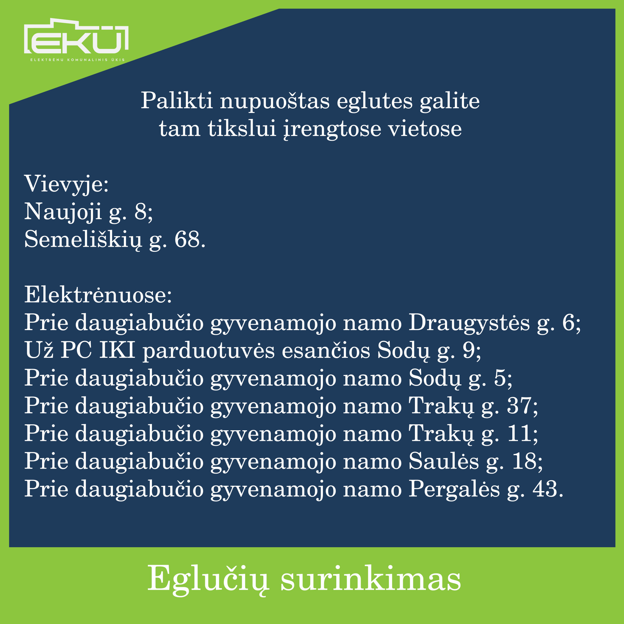 Nuo š.m. sausio 7 d. UAB „Elektrėnų komunalinis ūkis“ vykdys nupuoštų eglučių surinkimo akciją Elektrėnų ir Vievio miestuose.