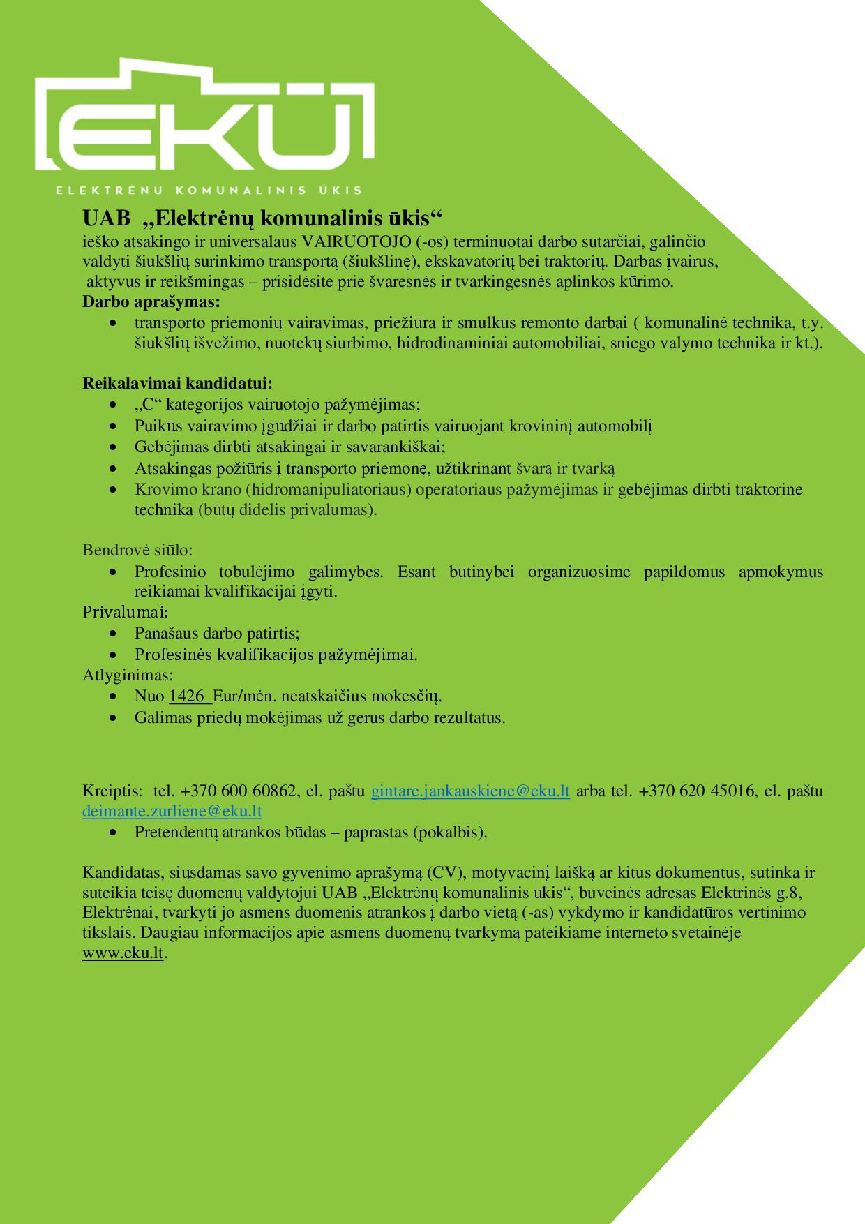 Kandidatas, siųsdamas savo gyvenimo aprašymą (CV), motyvacinį laišką ar kitus dokumentus, sutinka ir suteikia teisę duomenų valdytojui UAB „Elektrėnų komunalinis ūkis“, buveinės adresas Elektrinės g.8, Elektrėnai, tvarkyti jo asmens duomenis atrankos į darbo vietą (-as) vykdymo ir kandidatūros vertinimo tikslais. Daugiau informacijos apie asmens duomenų tvarkymą pateikiame interneto svetainėje www.eku.lt.